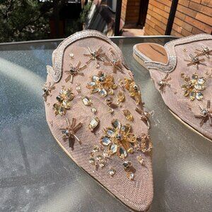 slip on shoes, sequins, party, pointed toe, sheer flats, statement, boho, slippers, unique, free people shoes, crystal mules, sheer flats, pointed toe slip-ons, mesh, embellished flats, gold cream shoes, boho chic flats, rhinestone flats, fp collection, women's size 7