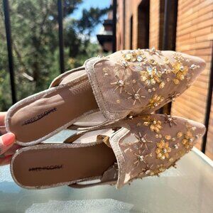 New Free People Sierra Sheer Crystal Mules Flats Womens 7 Gold Cream Slip-On