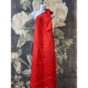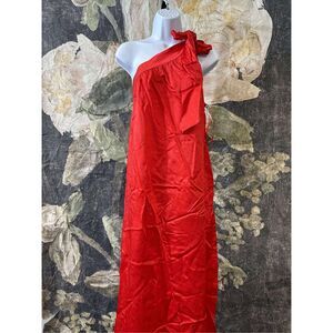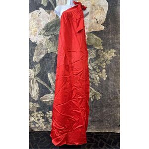 This silky maxi dress designed in a shapeless silhouette features a one-shoulder bow tie strap and gathered-pleat detailing from neckline.