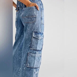 New Free People Sutton Utility Overalls Denim Cargo Jumpsuit Paint Splatter