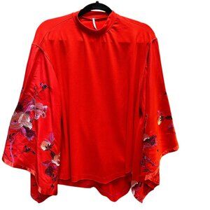 New Free People Sydneys Batwing Kimono Sleeve Top Red Fire Orange Embroidery SM