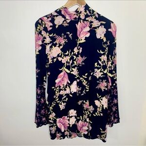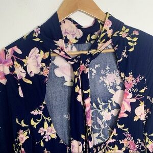 Turn heads in this stunning Free People mini dress, featuring a rich navy background adorned with vibrant pink, blush, and cream floral prints. The high neckline and flowy bell sleeves bring an effortlessly bohemian vibe, while the flirty open back with tie detail adds the perfect touch of allure. Lightweight and breezy, this dress is perfect for date nights, brunch, or festival season.