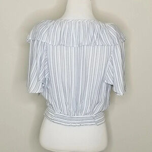 New without Tags Free People The Rosemary Top in blue and white striped print. Cropped silhouette. Tie hem and ruffle trim. Short sleeves. Button front closure. Tie accent at center hem.
