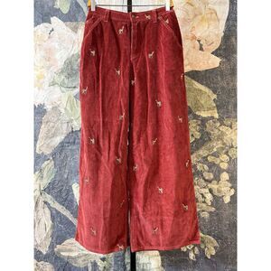 Features: Button fly closure, five-pocket styling, soft corduroy fabrication, reindeer motif embroidery