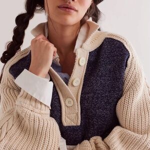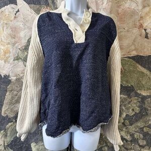 Features: Soft cotton fabrication, collared-neckline with button closures, contrast cable knit sleeves with elasticated cuffs, rolled hem