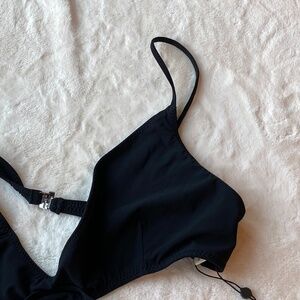 New with tags!  Twisted triangle Bikini Top. Classic Triangle top. Twisted waist tie. Thin rouleau straps. Silver E-hook closure.  72% NYLON 28% ELASTANE