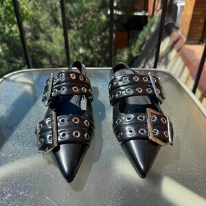 flats, buckle shoes, shoe, buckle, sling back, slingbacks, unique, statement, summer, spring, mules, mule, point toe, pointed toe, ganni, ballerina shoes, leather shoes, jeffrey campbell debb flats, free people slingback flats, black buckle flats, pointed toe slingbacks, vegan leather flats, grommet strap shoes, jeffrey campbell for free people, black slingback shoes, edgy flats