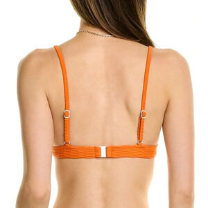 Introducing the Solid & Striped The Morgan Bikini Top - the ultimate beach and resort swim essential for women who want to make a statement in style. This trendy bikini top comes in the beautiful Chain Rib design with a Pumpkin color that is perfect for your next tropical getaway. Featuring adjustable shoulder straps, white hardware, and removable soft cups, this top fits like a dream and provides comfortable support all day long. The back clasp closure ensures a secure and snug fit, while the 85% Polyamide and 15% Elastane construction means it's also machine washable for easy care. This is a top only, and the coordinating bottom is sold separately. Made with quality and care, this bikini top is imported and from Solid & Striped, a brand that is renowned for its superior swimwear designs. Order yours today and prepare to turn heads on the beach.