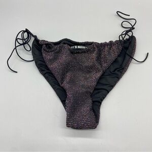 This string-style pant is lined, featured in metallic gold lurex fabrication and offers cheeky to medium coverage with thin adjustable ties at the hips. Gather in or flatten out at the waist to provide mid coverage to Brazilian depending on your mood!