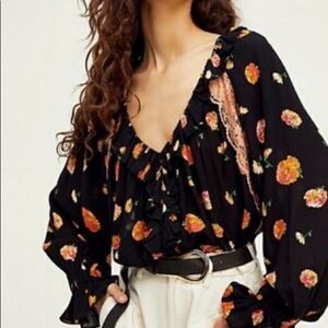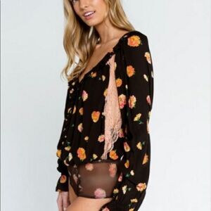 Color-Black Combo. Meet friends for lunch or enjoy a picnic in the park with style wearing this ruffled bodysuit illustrated in a meadow of colorful poppies.