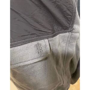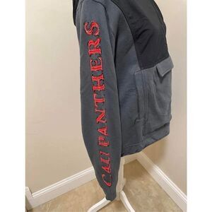 Features: Soft terry fabrication, full-zip hood lined in nylon, quarter-zip at front, square kanga pocket with flap closure and hand pockets, collegiate-inspired patches at sleeve, bungee cord at interior of bottom hem for adjustability, ribbed cuffs and bottom band