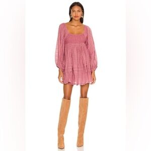 Simple yet chic, this mini is featured in a feminine eyelet fabrication and long-sleeve style with gathered skirt detail and a stretchy smocked back. **Fit:** Babydoll-style, A-line hem **Features:** Soft eyelet fabrication, square-neckline with picot trim, balloon-inspired sleeves with elasticated cuffs, smocked back panel, gathered skirt, lined **Why We ❤ It:** This eyelet mini can be dressed up or down for any occasion. Malina Mini Dress by Free People in Sun Blush,