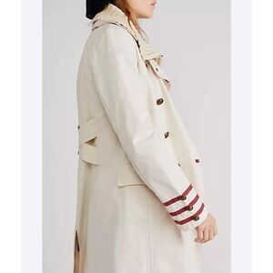 Features: Button-front closure, side pockets, classic collar, bottom slit at back, cross straps at back waist