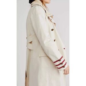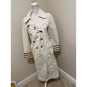 So cool and classic, this timeless longline jacket is featured in a staple, button-front silhouette with contrast stitching throughout and stripes at sleeve cuffs for an added sporty touch.