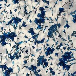 Features a floral-printed front and back panel in vibrant shades of blue on a soft white background.