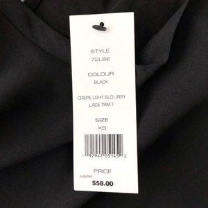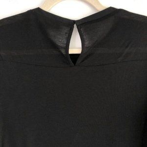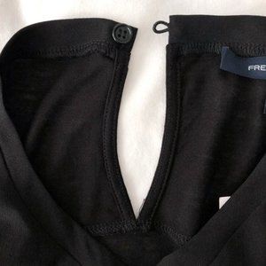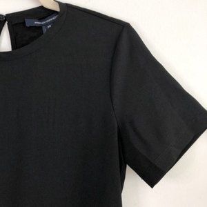 French Connection lightweight crepe and solid jersey mixed media top. A classic and sleek crew neck short sleeve tee with a pretty eyelet trim. Crew neckline. Back keyhole with button & loop closure. Short sleeves. Small side slits. Scalloped sheer eyelet trim. Solid black color. Woven front body and trim material: 100% polyester. Knit back body material: 100% lyocell.
