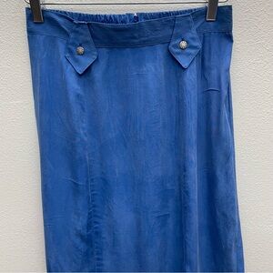 New Frontier Clothing Co Vintage Blue Maxi Skirt. Size Medium. A-line 6-panel maxi skirt. Waistband has front tabs with silver tone button embellishment. Back of waistband is elasticized for comfortable fit. Zip closure at mid-back. Unlined. Excellent preowned condition. (NOTE: Matching blouse size large being sold separately).