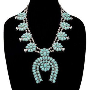 New Full Squash Blossom Natural Turquoise Stone Silver Western Necklace