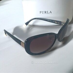 New Unused In Case Authentic Furla Venus Sunglasses In A Gradient Black Color With Gold F Furla Logo and White Accent At Arm Tip. Details: