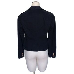 Modern twill blazer in sleek black featuring subtle black embroidery of scrolling peacock feathers and filigree. Two front faux pockets, rose blossom sleeve buttons and v-notched lapel.