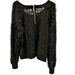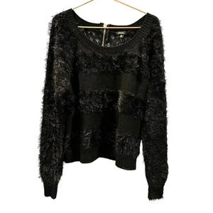 Front is black on black stripes with black fuzzy material and black knit sweater material