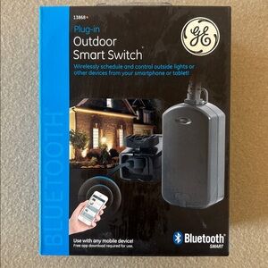 Brand new inbox, GE plug-in outdoor smart switch, model 13868. This has been opened only to show the contents. It has never been used. First photo is a stock photo. Remaining photos are the actual item you will receive.