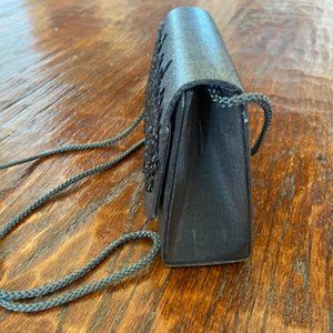 VINTAGE ~ A small EVENING BAG (that perfectly matches a pair of MICHAEL ANTONIO glittery gunmetal gray strappy sandals, size 8-1/2, that I also have listed). This was used once (at my youngest daughter's wedding in 2007) and kept in a closed box on shelf in my closet ~ but looks absolutely BRAND NEW. It has a long twisted rope gray cord if you want to use it as shoulder bag, but in 2nd to last photo you can see how it's attached inside so the cord can just go inside the purse if you want to use it as a clutch. ** Small pocket inside (maybe a lipstick?) ** Lots of dark GRAY BUGLE BEADS on the front flap (all are securely in place). Snap closure.