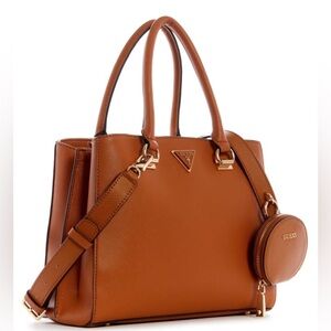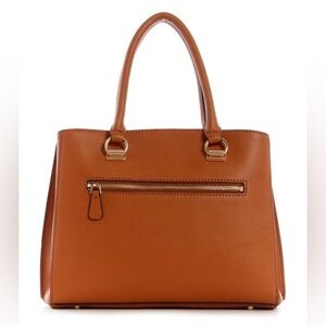 Carry this everywhere, saffiano textured faux-leather satchel designed with a detachable shoulder strap, rolled top handles and logo hardware. Complete with a matching zipper pouch keychain.