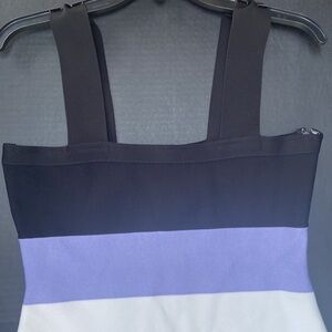 This ultra-chic combination of color-blocking, ultra-sleek fit and wide straps in this bandage dress make it an irresistible day or night staple to your wardrobe. Side zipper closure.