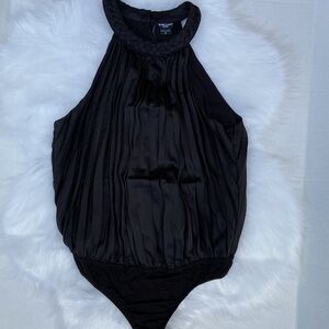 This silky bodysuit is designed with polished pleats that are ready to wow. Featuring a braided detail along the halter neck with a button closure. Finished with a thong bottom with snap-button closures.
