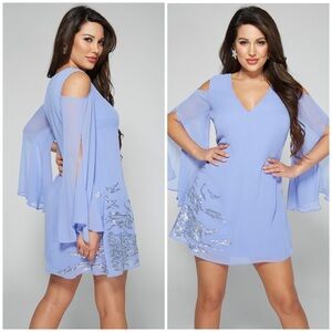 Elegance is easy with this V-neck tunic dress featuring a flowy cold-shoulder design and a sequin design at hem. Back zip closure.