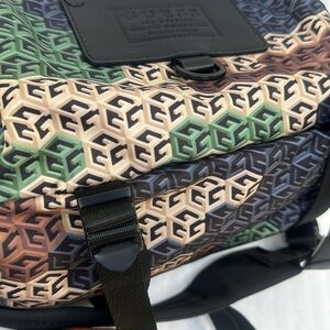 Chic GUESS bag with geometric design. Features black and red accents.