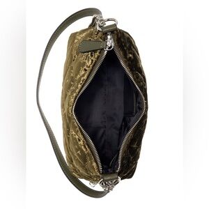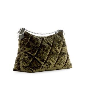 The glam piece your closet needs. A velvet crossbody featuring a quilted design, zip-top closure, logo emblem and mix-media strap.