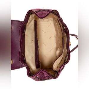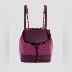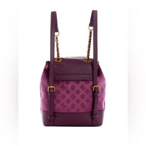 Faux-leather backpack featuring a brushed velvet midsection with debossed logo pattern and a mixed-material strap that allows for conversion into a crossbody. Fold-over flap closure with logo emblem and drawstring security.