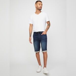 A drawstring waist and rolled cuffs define these denim shorts featuring whiskering and a five-pocket design.