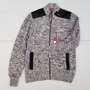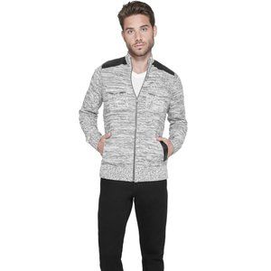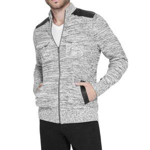 Layer up with this marled knit zip-up sweater jacket featuring faux-leather accents.