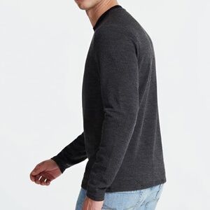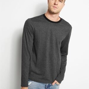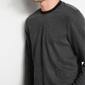 Upgrade your everyday knits with the addition of this ribbed long-sleeve tee with a multi-linear design. Features solid crewneck and small logo patch at side83% Polyester, 15% Rayon, 2% Spandex