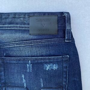Guess adds timeless style to your casual denim collection with these cool rip-and-repair detailed straight-leg jeans.