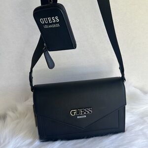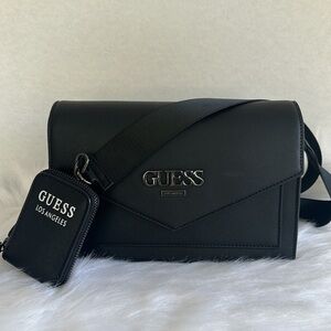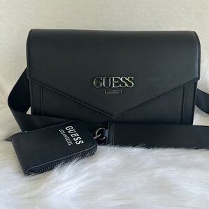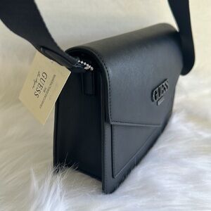 Bring the shine when you carry this faux-leather crossbody featuring an allover sparkling finish with a logo emblem on the fold-over flap and webbed strap.