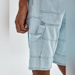 A pair of denim carpenter shorts featuring a windowpane design made from pintuck details, a side utility pocket and hammer loop at the hip.