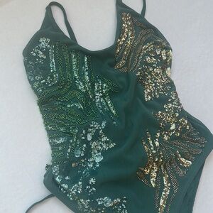 Find your spotlight in the sun with this one-piece swimsuit featuring a sequined design at front and low back with lace-up closure.