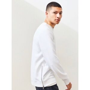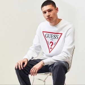 Tri Logo Zipper Crew Neck Sweatshirt by Guess. •White solid color • Guess tri logo graphic in red • Crew neck • Long sleeves • Ribbed neck, cuffs, and hem • Exposed side zipper • Machine Washable