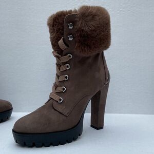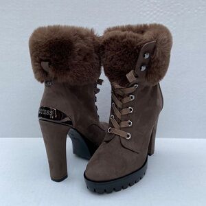 Turn heads in the chic and sexy GUESS Trisia boot. Faux fur trim adds a cozy touch to these show-stopping heels. Metal heel counter features the GUESS wordmark. Man-made upper. Man-made lining. Man-made insole. Man-made outsole. Imported. Measurements: Heel Height: 5 in Weight: 1 lb 4 oz Circumference: 11 in Shaft: 9 in width M.