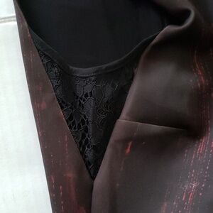 lace, neoprene, no appliqués, floral design, v-neck, sleeveless, no pockets, rear closure, hook-and-bar, zip, fully lined, stretch, pencil style.