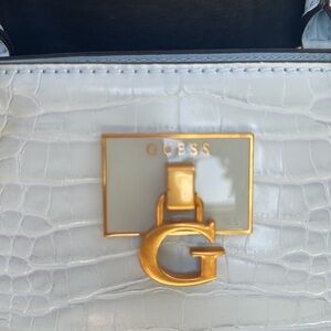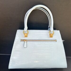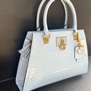 Posh and sophisticated, this faux-leather satchel features rolled top handles, dangle G-logo and logo keychain.