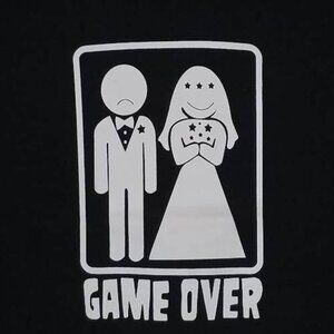 Design: Classic silkscreen print featuring a humorous bride-and-groom “Game Over” image