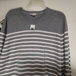 New gap light sweater size women's XL. It is gray with white stripes armpit to armpit 22 inches 26 inches long.