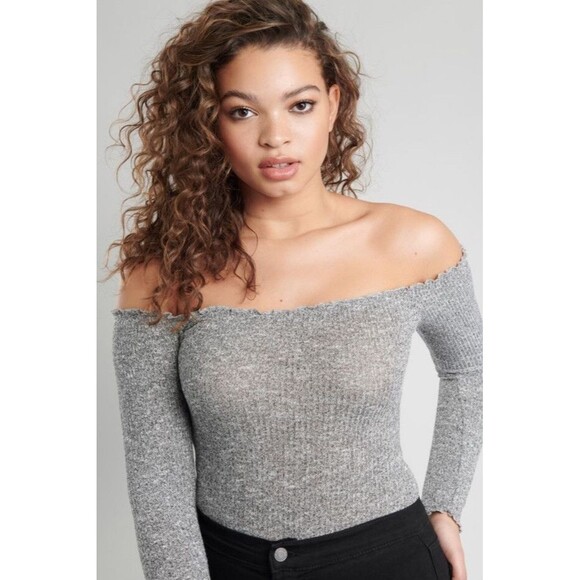 Brand new without tags Garage off the shoulder bodysuit in salt and pepper gray. Material is 67% polyester 28% rayon 5% spandex. Features lettuce edge detailing. Fitted ribbed stretch knit. Double snap closure.