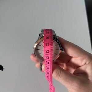 Stylish watch with a two-tone band. Features a white dial and elegant design.