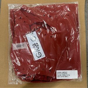 Smoke free, pet free warehouse. New with tags sealed in manufacturer plastic. Terracotta rust orange color. One shoulder. Full length. Laser cutouts around edges.